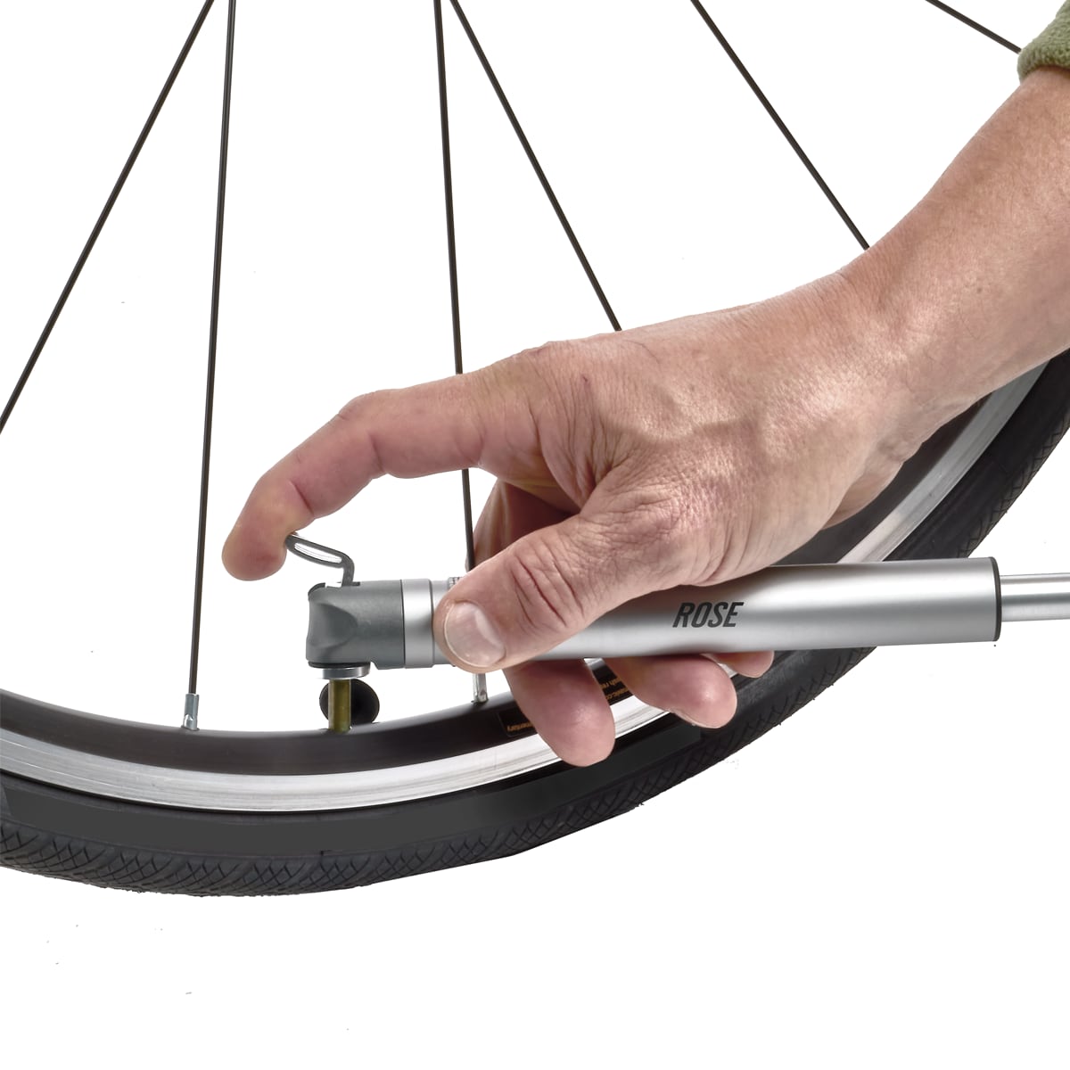 A universal all-rounder shows its skills. No matter whether you need a lot of pressure or a lot of air on your road bike, gravel bike or MTB: ROSE’s airik Vario HP/HV CNC serves them all! The non-slip pump body not only impresses with optimum valve compatibility, but also with first-class handling and high efficiency. The small aluminium housing conceals two adjustable pump modes, which are designed for tyres with high volume (HV), such as MTB tyres, or high pressure for road bike tyres (HP). The motto is to inflate as needed so that inflating your tyres does not become a feat of strength.