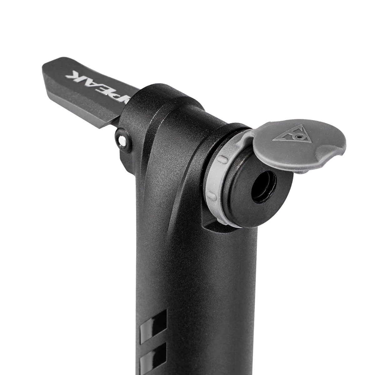 Thanks to the integrated dust cap, the dual action pump head of the Topeak Mountain DA bicycle pump is excellently protected against dirt and the practical thumb locking lever ensures an absolutely airtight connection to the valve.