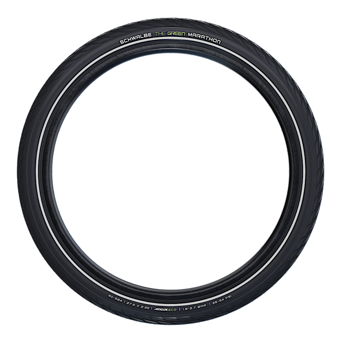 The Schwalbe Green Marathon proves that recycling is compatible with proven tyre quality. Being a pioneer in puncture protection, mileage and environmental friendliness, the proven city and touring tyre has become even more sustainable in the "green" version. Production with Fairtrade rubber under the Fair Rubber label contributes to improving the working and living conditions of producers. The tyre is almost completely free of pollutants and consists of almost three quarters recycled and renewable materials. For the black-coloured soot, Schwalbe uses products made from recycled bike tyres.